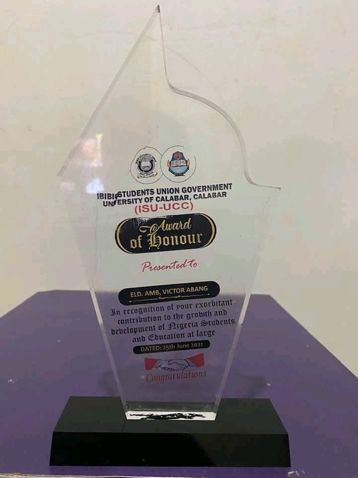 The department of philosophy students body Unical have on Saturday presented an award of honour to Eld.Amb. Victor Abang on Saturday 12th June 2021 at Etaval hotel Calabar pet Media & events can authoritatively report.