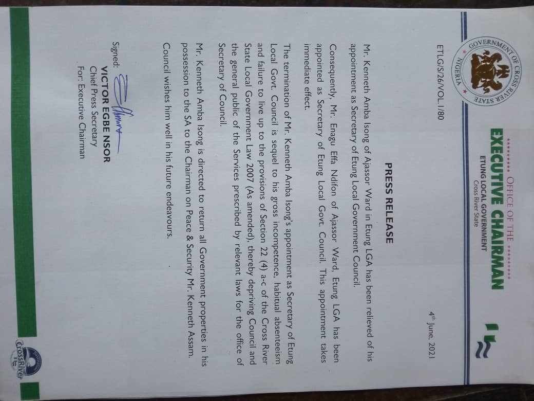 Mr President has also relieved Inyang Iboro Sunday of his appointment as Cheif Protocol Officer to the SUG President.