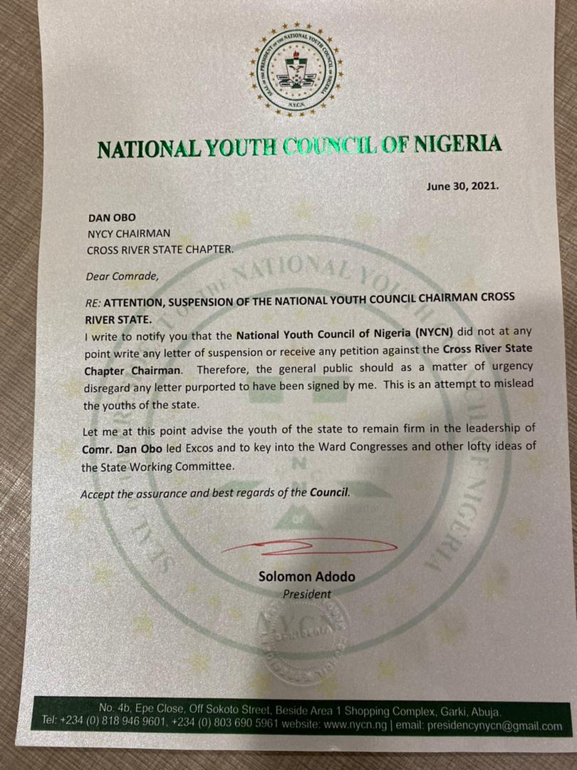 The national youth council leadership of Nigeria have in two different letter drop report of the suspension of the CRS youths commander Comr Dan Obo & equally another report refuting claims of earlier report on his reinstatement.