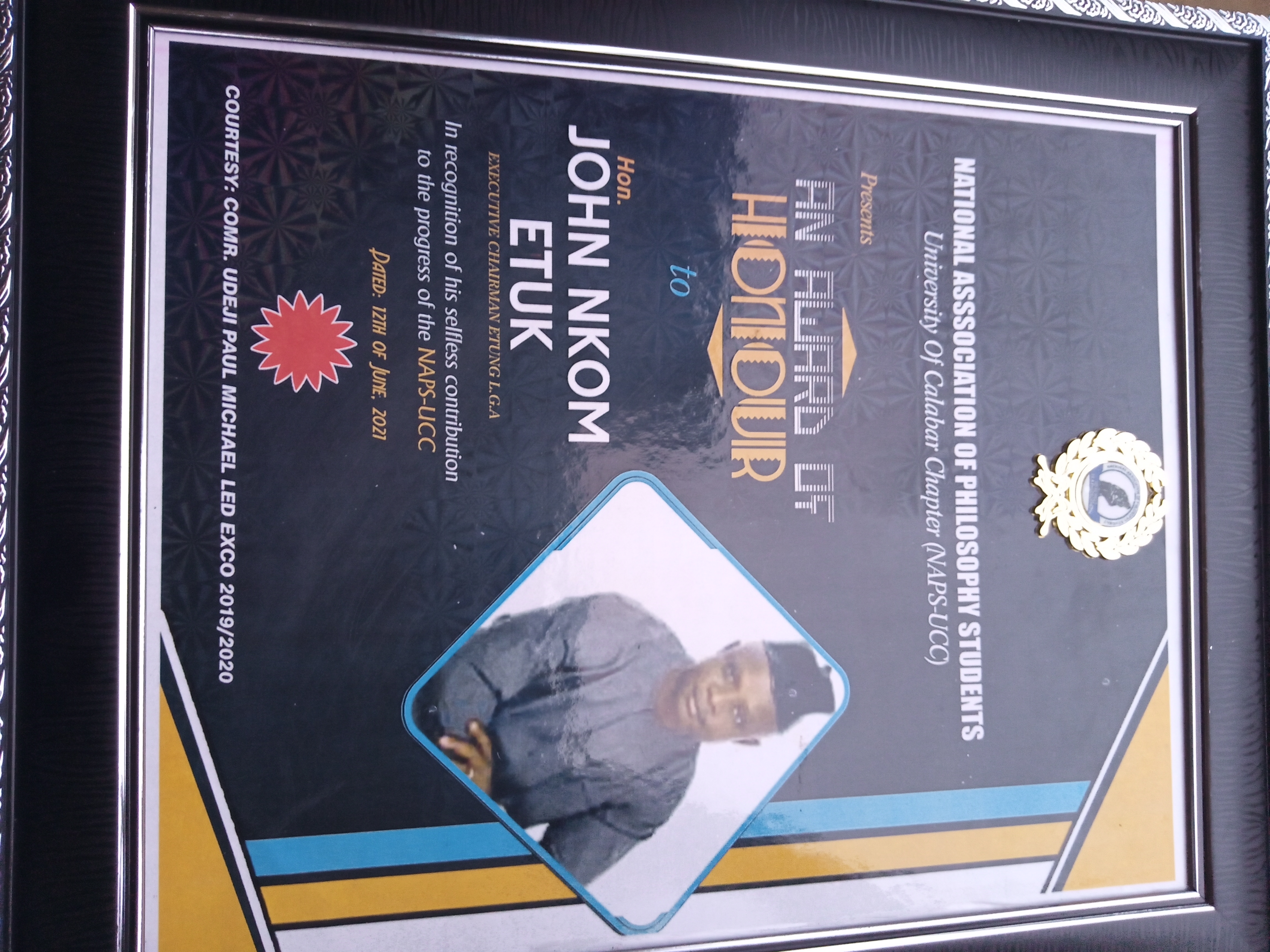 The executive chairman of Etung LGA, Ntufam hon (Comr) John Nkom Etuk on Saturday 12th of June was honoured with an award from the prestigious philosophy students association Unical for his selfless services to humanity and students unionism.